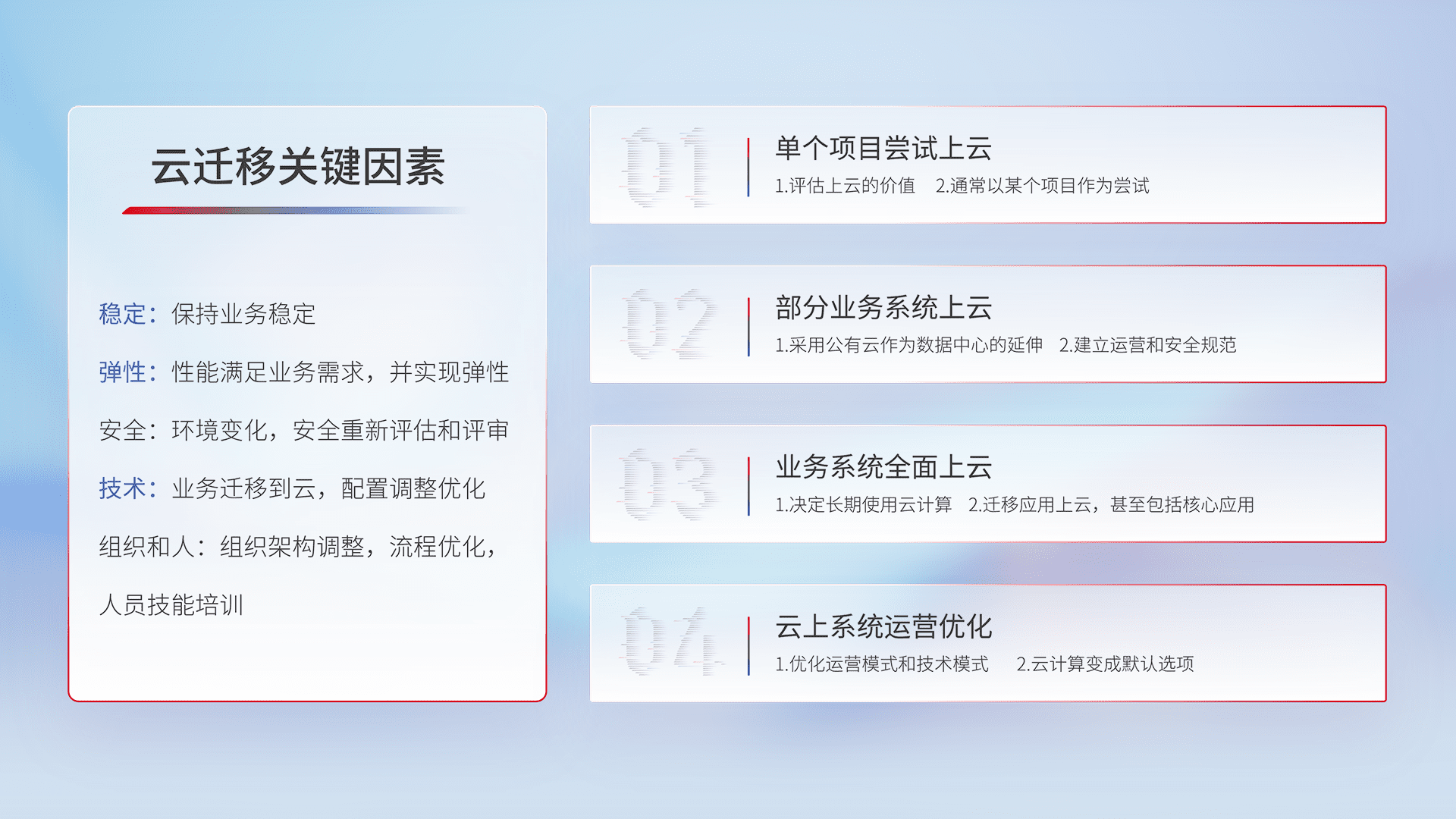 结合实际业务,,从规划设计、、云平台选型、、云原生改造、、、、数据迁移、、、集成交付,,,,迁移全过程为客户识别最佳上云路径,,,做好风险识别管理,,设计网络架构、、、、身份权限、、、、安全审计合规、、、操作审计、、日志审计、、、、监控告警策略、、多站点容灾设计等,,对云上基础设施进行整体规划,,提升IT治理水平,,以满足弹性、、高可用、、、高性能的需求。。。。