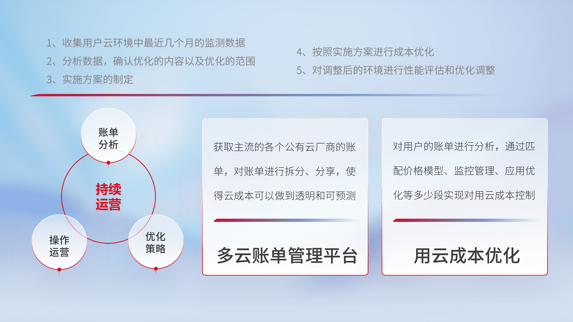通过多云纳管,,,以统一的资源数据模型把客户的云资源进行抽象和封装,,,,进而实现对多云资源的统一操作,,,,保障云资源管理的可靠性、、稳定性与可用性。。量身定制化运维内容,,配置、、开发运维、、、、补丁管理、、、、备份、、、监控、、、认证和访问管理、、、、审计和日常巡检等,,,,保障在用云过程中的可靠度,,稳定度以及高可用率。。